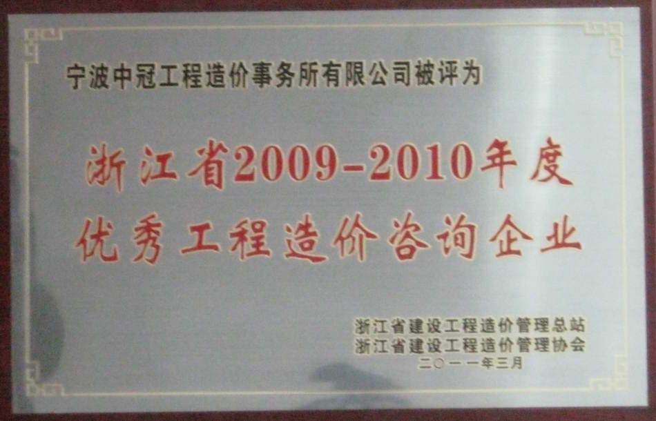浙江省2009-2010年度优秀工程造价咨询企业-中冠荣誉-中冠咨询-2024新澳门开门原料免费