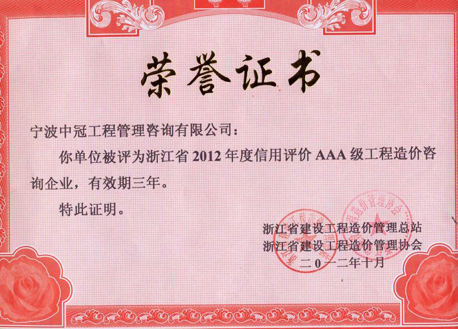 2012年度信用评价AAA级工程造价咨询企业-中冠荣誉-中冠咨询-2024新澳门开门原料免费