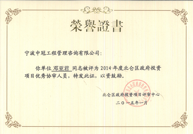 我司邓亚君同志于2015年1月,被宁波市北仑区政府投资项目评审中心授予2014年度北仑区政府投资项目优秀协审人员称号。
