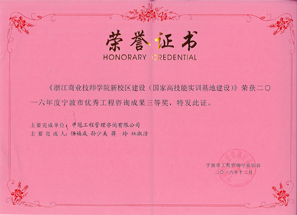 根据宁波市工程咨询行业协会,近期发布的《关于公布2016年度宁波市优秀工程咨询成果奖获奖项目名单的通知》(甬咨[2016]4号),经评审由我公司任福成、孙少美、蒋玲、林淑洁等人员编制的《浙江商业技师学院新校区建设(国家高技能实训基地建设)》项目可行性研究报告荣获2016年度宁波市优秀工程咨询成果奖三等奖。 特此报喜