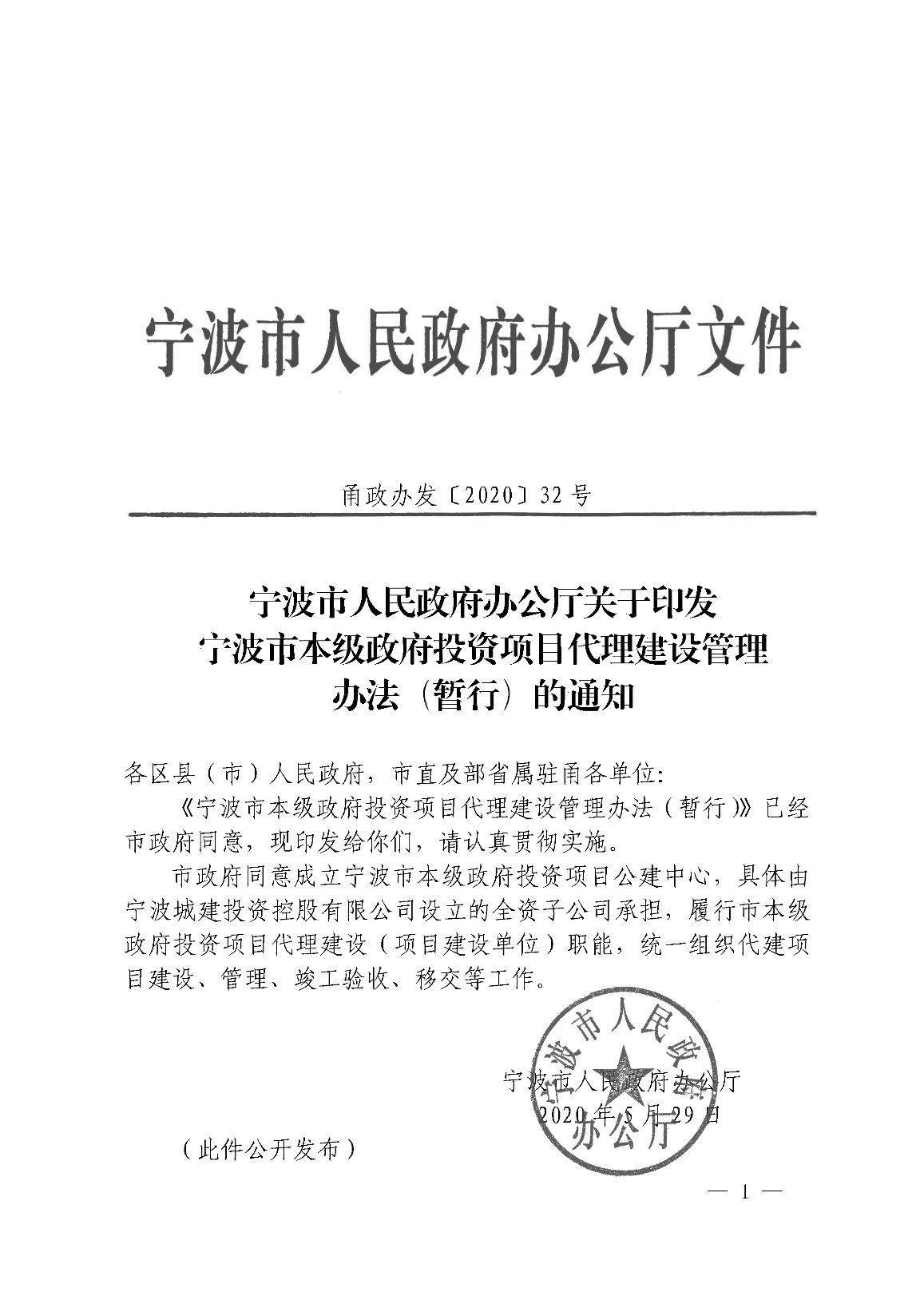 市政府同意成立宁波市本级政府投资项目公建中心,具体由宁波城建投资控股有限公司设立的全资子公司承担,履行市本级政府投资项目代理建设(项目建设单位)职能,统一组织代建项目建设、管理、竣工验收、移交等工作。